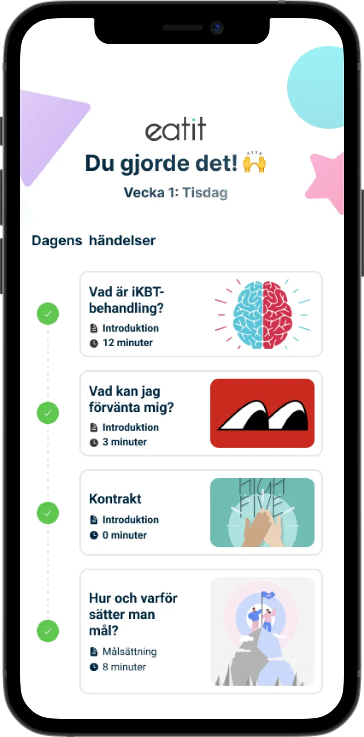 Kom Igång →Första samtalet sker via video med din Personliga dietist som du valt i Eatits app. Tillsammans tillägnar ni första samtalen för att prata om dina behov och om du är berättigad viktprogram via det offentliga vårdsystemet. Patientavgift 0 kr.